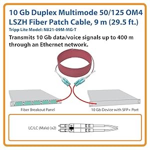 The low-smoke zero-halogen (LSZH) jacket limits the amount of toxic smoke emitted in case of combustion, making the N821-09M-MG-T perfect for poorly ventilated areas. The slim, space-saving uniboot design is easy to manage through ceilings, walls and ducts. The sturdy plastic housing is built to last a long time. The cable meets current IEEE 802.3ae and TIA LOMMF standards.
