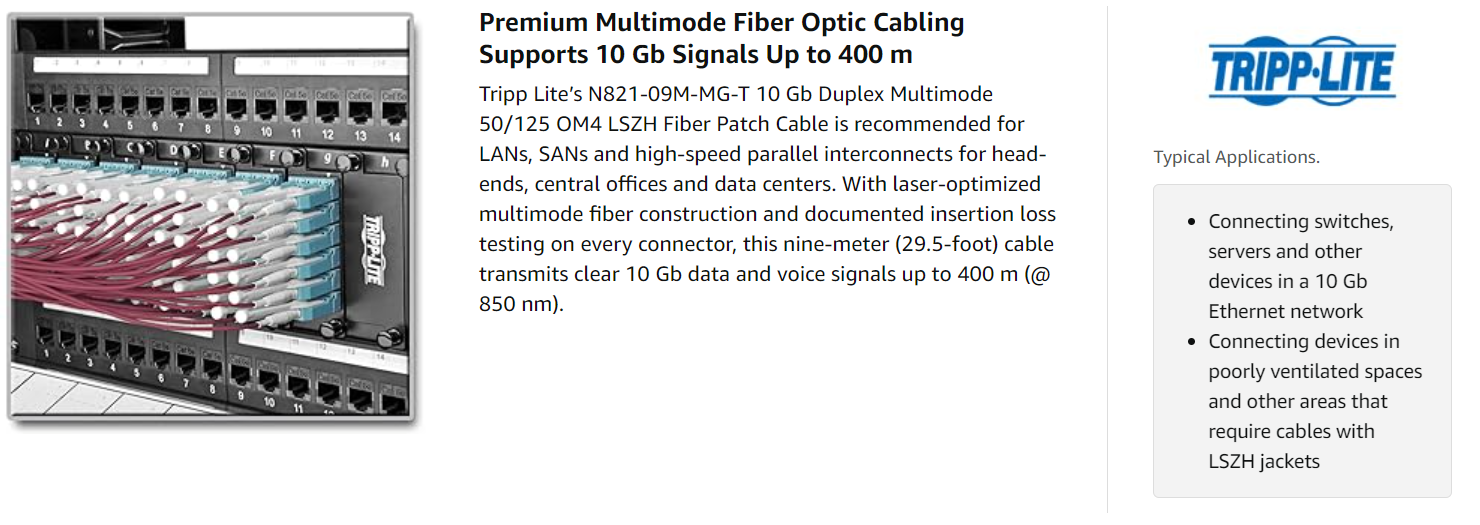 The low-cost N821-09M-MG-T provides four times more bandwidth than conventional 62.5 µm multimode fiber and performance rivaling that of singlemode cable. Colored magenta for immediate identification as an OM4 cable, the N821-09M-MG-T is backward compatible with existing 50/125 fiber. It’s often used with vertical-cavity surface-emitting laser (VCSEL) and LED laser light sources.