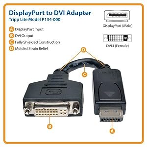 Don’t settle for less than the best—enjoy superior video quality! This Tripp Lite DisplayPort to DVI Passive Adapter ensures peak performance when displaying a single DisplayPort video signal on a DVI monitor. Unlike cut-price cables and adapters, the P134-000 is manufactured to exacting specifications, using superior materials, for a difference you can clearly see. And we back our pledge of quality with a 3-Year Limited Warranty.