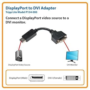 The P134-000 allows you to display the image from a DisplayPort computer on a DVI monitor. It supports DVI Single Link computer video resolutions of up to 1920 x 1200 and HD resolutions of up to 1080p. It is compatible with any PC or Mac equipped with a female DisplayPort CPU port.