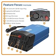 Just connect the DC input plug with 3-foot cord to the 12V outlet in your vehicle, and the PV375USB is ready to operate. To prevent you from running down your battery, the PV375USB turns off automatically if the input voltage falls to 10V or if it gets too hot. For instance, if the connected devices exceed 180 watts with the DC plug, the PowerVerter may overheat and shut down.
