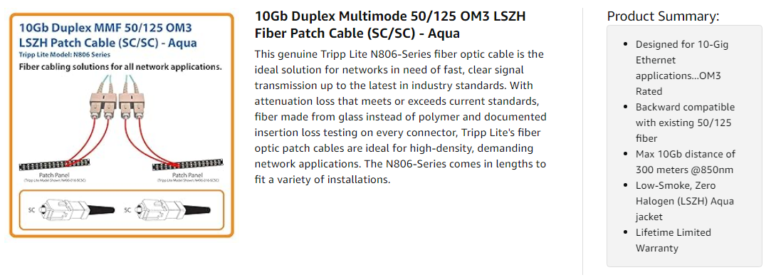 The N806-Series is manufactured using top quality materials. With 10Gb 50/125 duplex fiber, a Low-Smoke, Zero Halogen (LSZH) jacket, sturdy connectors and fiber made from glass instead of a polymer, Tripp Lite's fiber optic cables are made to last in high-demand data center and networking applications. The N806-Series is compliant with RoHS (Reduction of Hazardous Substances) standards, reflecting Tripp Lite's commitment to environmental responsibility.
