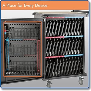Clutter-Reducing OrganizationA dedicated place for every device and cable makes it simple to find what you need. - Numbered slots with removable dividers hold laptops up to 15 inches. - Color-coded shelves and power strips identify zones. - Overhead cable managers keep cords neat. - Removable storage baskets hold power adapters. |