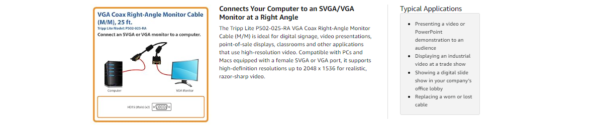 The 25-foot molded cable features premium foil and braid shielding, as well as mini-coax (RGB) and paired video wire construction, to deliver top-of-the-line signal quality and protection from EMI/RFI interference. Gold-plated HD15 male connectors with gold-plated copper contacts ensure excellent conductivity. Integral strain relief ensures the cable and connectors last a long time.