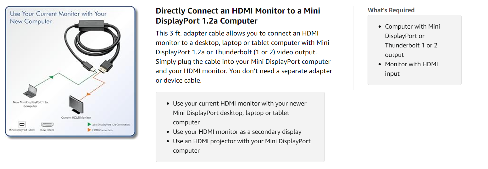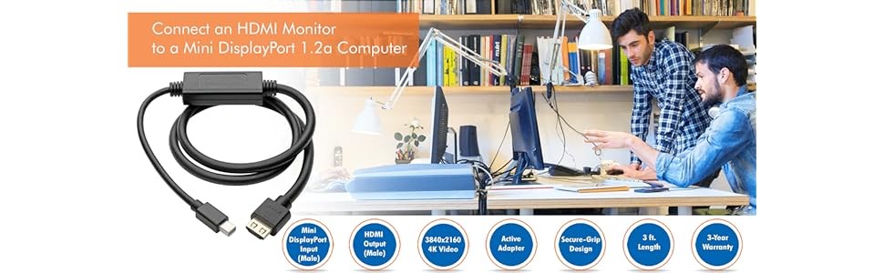 This active adapter cable helps you save money by making your current HDMI monitor compatible with a Mini DisplayPort-equipped computer. High-quality connectors provide maximum conductivity to ensure a clean, consistent video signal.