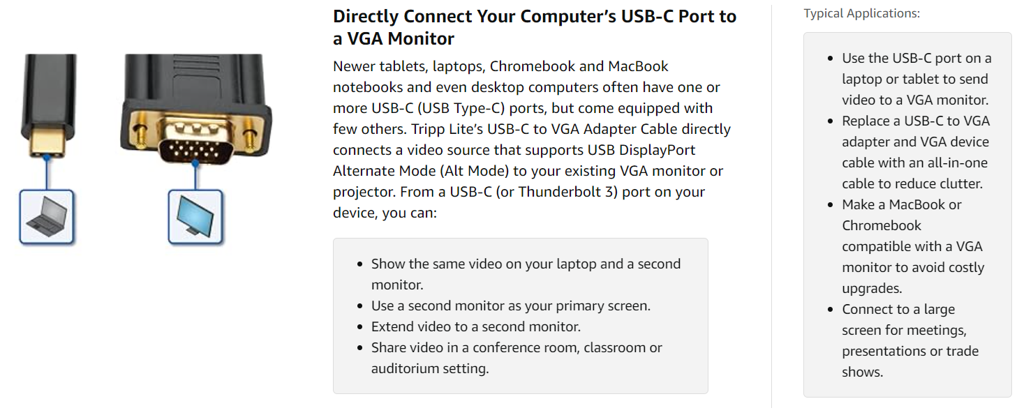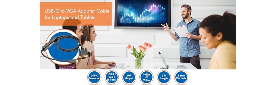 Display High-Definition Video on a VGA MonitorThis adapter cable supports USB DisplayPort Alternate Mode for transmitting high-definition video: - Video resolutions up to 1920 x 1200 at 60 Hz (including 1080p). - 36-bit Deep Color (12 bits per channel). - USB 3.1 Gen 1 data transfer rates up to 5 Gbps. |
