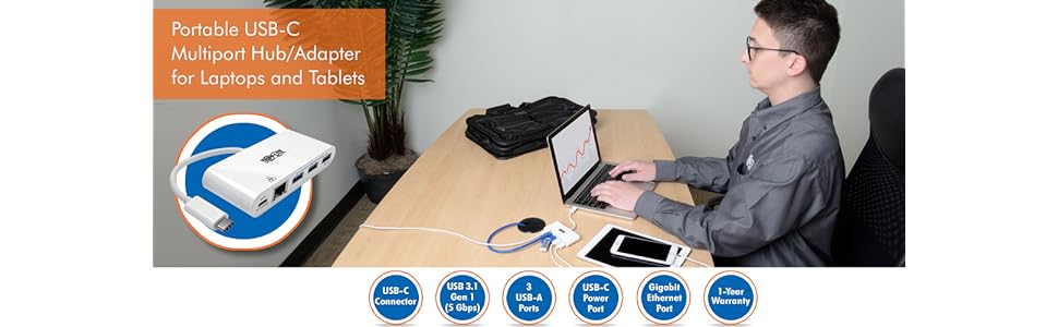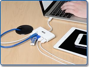 Newer tablets, laptops, Chromebook and MacBook notebooks and even desktop computers often have one or more USB-C (USB Type-C) ports, but come equipped with few others. Tripp Lite’s portable USB-C multiport hub expands the functionality of the USB-C (or Thunderbolt 3) port on your device and makes it compatible with your existing equipment. From a single USB-C port, you can: