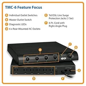 The TMC-6 offers premium surge protection for PCs and all electronics. It provides 6 5-15R outlets, including 4 that are equipped with their own individual switches, plus single-line tel/DSL line surge protection. Its low-profile, under-monitor design makes the TMC-6 easy to integrate into any home or office PC setup. A 6 feet cord enables connection to a distant wall outlet, and a space-saving, right-angle 5-15P plug allows furniture to be placed flush against the wall.