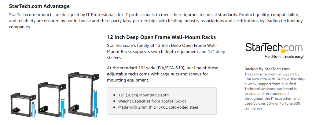 StarTech.com racks are designed with easy-to-read U Height markings on the posts and adjustment markings (at 1 inch increments) to make it easy and quick to mount equipment and adjust mounting depth.