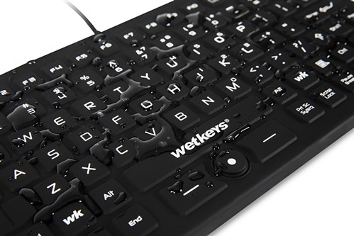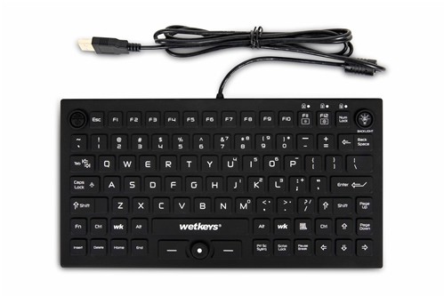 A professional-grade, mid-size, rigid, silicone, backlit, waterproof keyboard with integrated pointing device that is resistant to dirt, debris, water, soap, and disinfectants.
