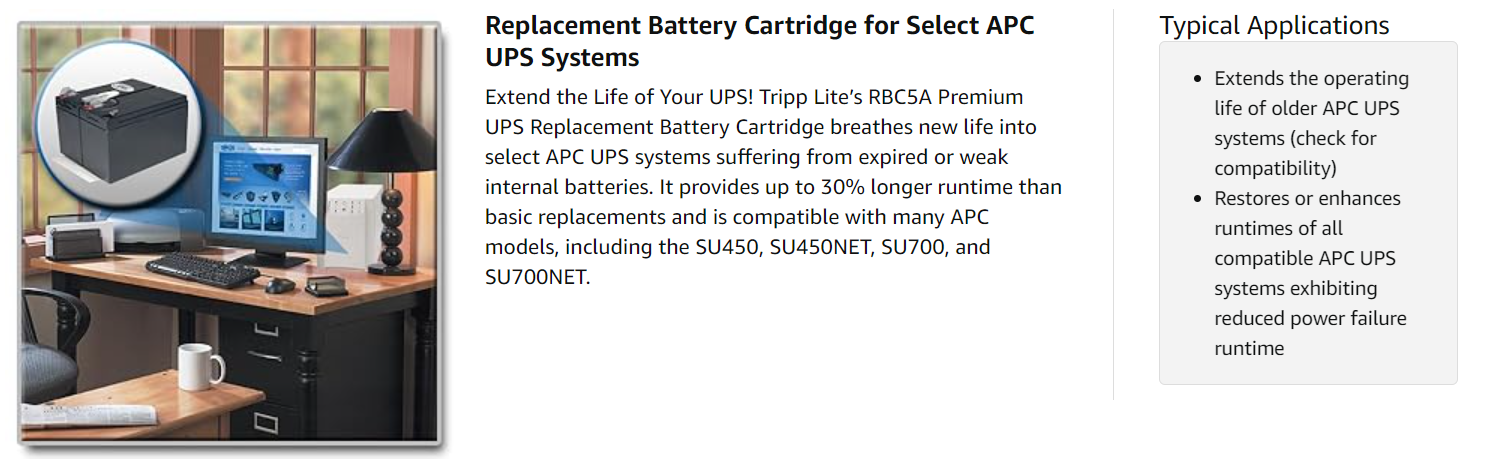 Like every Tripp Lite battery cartridge, the RBC5A is carefully screened and OEM-certified to meet or exceed original manufacturer specifications.