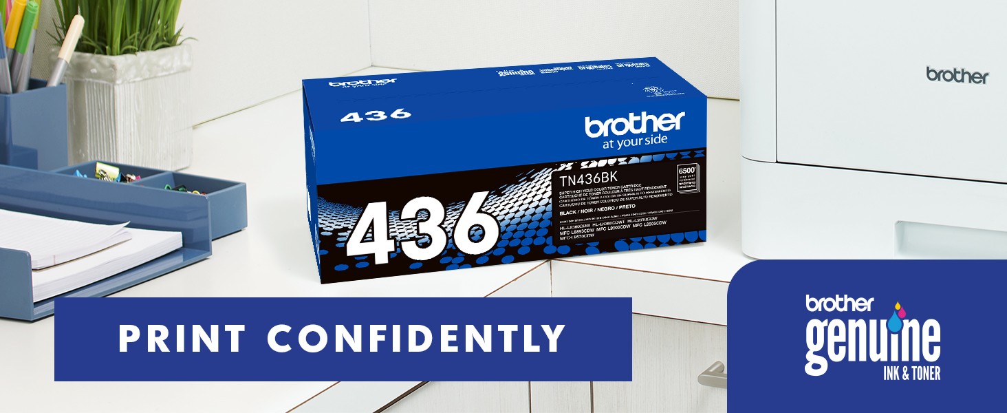 The TN436BK black toner cartridge provides professional laser print quality you can consistently rely on for up to 6,500 pages(1).