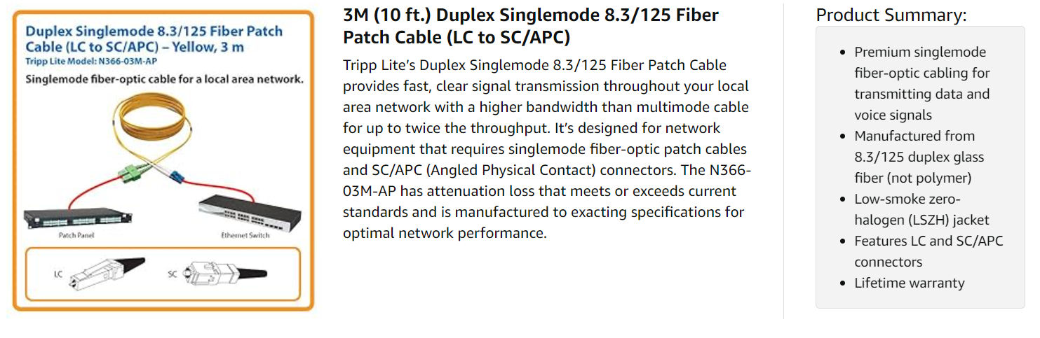 The N366-03M-AP is manufactured using top-quality materials. It has 8.3/125 duplex (zipcord) fiber made from glass instead of a polymer and sturdy LC and SC/APC connectors. It also has a low-smoke zero-halogen (LSZH) jacket, which limits the amount of toxic smoke emitted in case of combustion and is perfect for poorly ventilated areas. The jacket is yellow to identify the N366-03M-AP as a singlemode cable.
