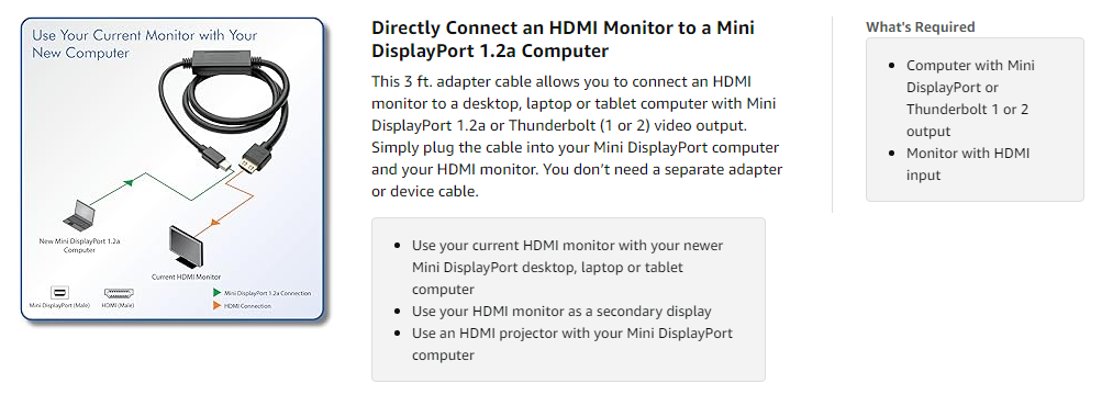 This active adapter cable helps you save money by making your current HDMI monitor compatible with a Mini DisplayPort-equipped computer. High-quality connectors provide maximum conductivity to ensure a clean, consistent video signal.