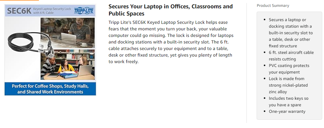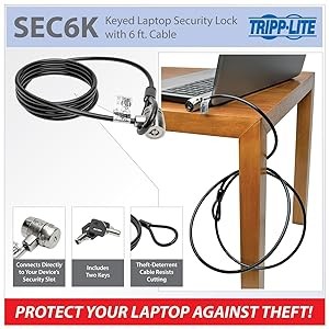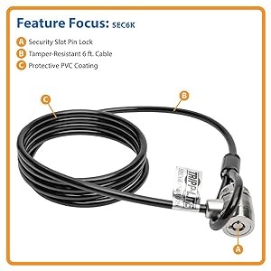 Made from steel aircraft cable, which consists of thin steel wires that have been stranded together, the SEC6K’s 6 ft. cable is flexible, cut-resistant and exceedingly strong. Steel aircraft cable gets its name, in fact, because it’s strong enough to secure an airplane in place. To protect your computer from scratches, the cable is coated with PVC.