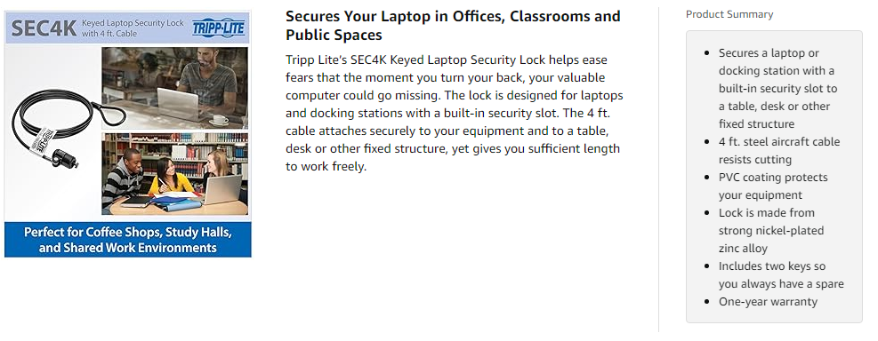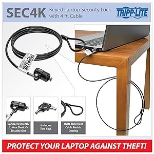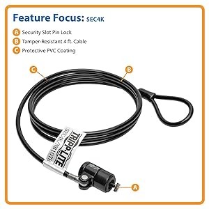 Made from steel aircraft cable, which consists of thin steel wires that have been stranded together, the SEC4K’s 4 ft. cable is flexible, cut-resistant and exceedingly strong. Steel aircraft cable gets its name, in fact, because it’s strong enough to secure an airplane in place. To protect your computer from scratches, the cable is coated with PVC.