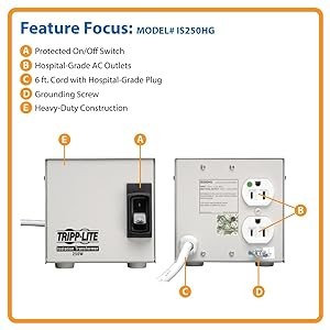 A 6-foot cord with 5-15P-HG hospital-grade plug allows for flexible installation, while two 5-15R-HG hospital-grade outlets let you plug equipment into the IS250HG without any adapters or custom power cords. Operation is easy; simply plug the IS250HG into a grounded three-prong utility outlet, plug your equipment into the IS250HG and turn the power on with the one-touch power switch.