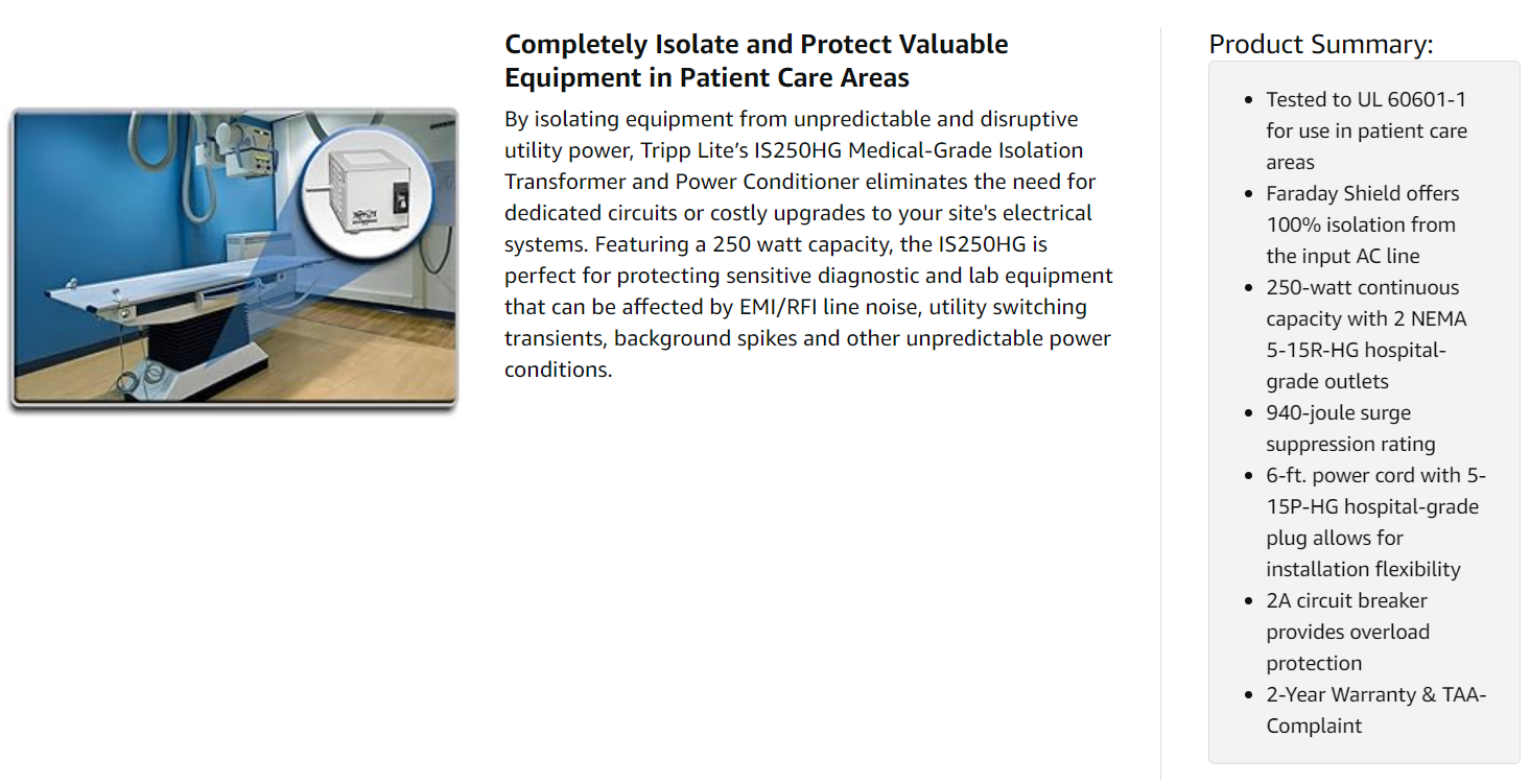 UL 60601-1 compliance is required for isolation transformers within patient care areas in order to avoid hazardous conditions and provide an optimally safe environment for patients, staff and visitors. By isolating equipment from unpredictable and disruptive utility power, the IS250HG eliminates the need for dedicated circuits or costly upgrades to a healthcare facility’s electrical system. The internal isolation transformer with Faraday Shielding provides 100% isolation from the AC power line for equipment plugged into the IS250HG and reduces leakage to less than 100 microamps for full UL 60601-1 compliance.
