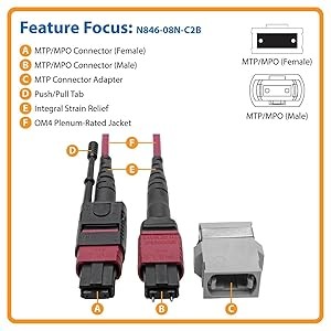 A magenta-colored jacket makes the N846-08N-C2B readily identifiable as an OM4 cable. A push/pull tab connector makes it easy to install and remove. Its 50/125 duplex glass fiber construction assures you of error-free signal transfer. This cable meets current IEEE 802.3ae and TIA standards. The cable’s plenum-rated jacket shows its serial number for quality control and traceability.
