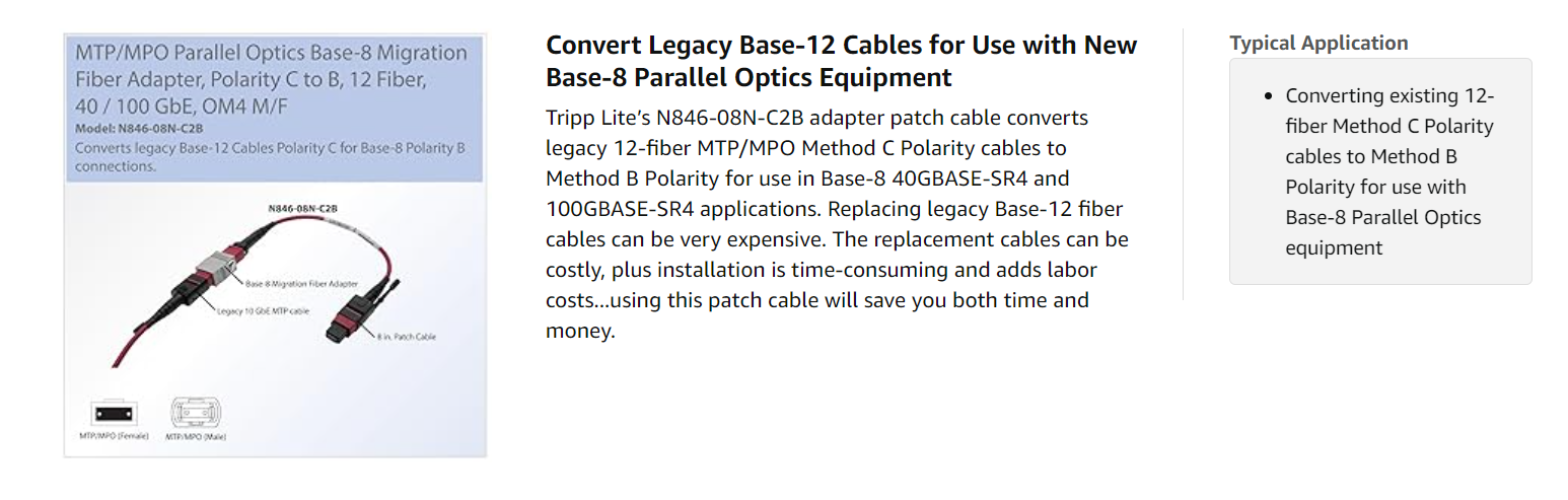Extend High-Density Network Connections or Use with Breakout CassettesThe N846-08N-C2B is an 8 in. OM4-rated patch cable that supports 40 Gb Ethernet speeds, making it ideal for high-density network connections in telecommunication rooms and data centers. It supports speeds up to 40 GbE / 100 GbE and is backward-compatible with existing 50/125 fiber. |