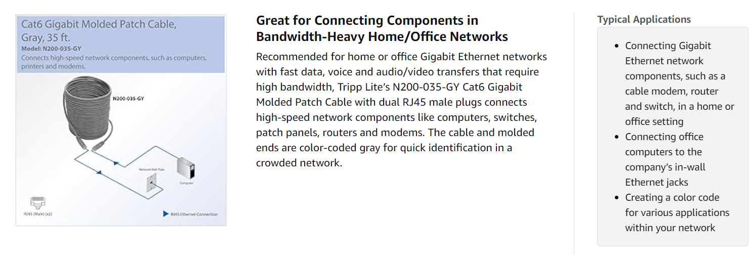 The N200-035-GY meets most current industry standards, including IEEE 802.3ab, IEEE 802.5, ANSI/EIA/TIA 568, ISO/IEC 11801 and ETL (category 6 draft 11). It holds near-end crosstalk (NEXT) levels to a minimum, while delivering a flawless signal. It is designed for 1000Base-T (Gigabit Ethernet), 10/100Base-T (Ethernet), 100 Mbps TPDDI, 155 Mbps ATM, ISDN, voice, Token Ring Type 3 and EIA/TIA applications.