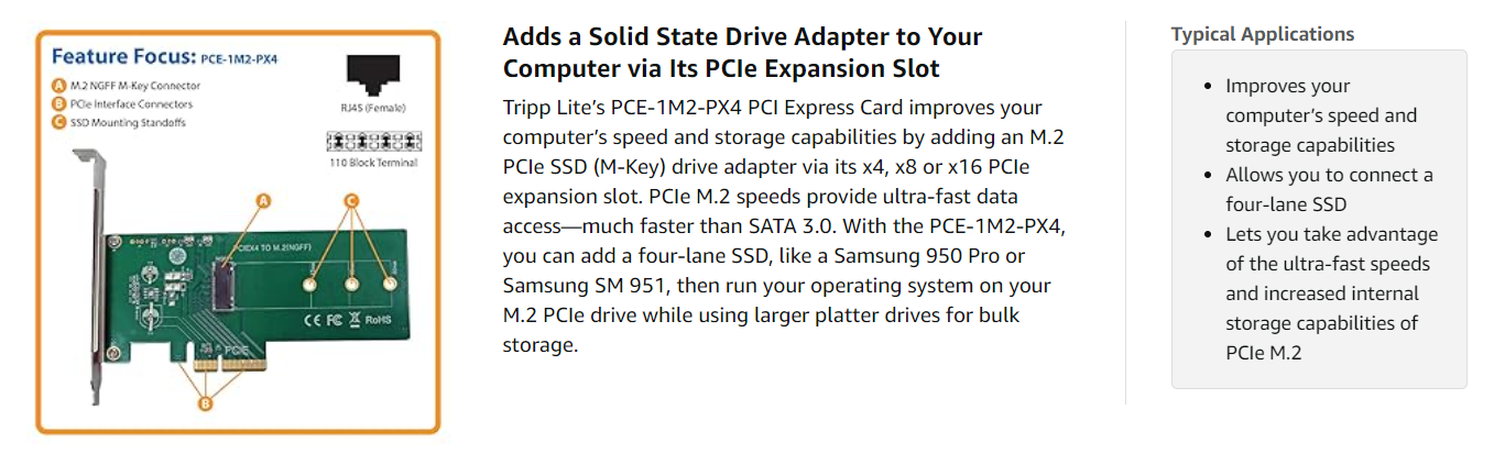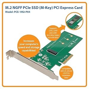 The PCE-1M2-PX4 supports 2242, 2260 and 2280 M.2 drive types (up to 80 millimeters) and works with Windows (XP and later) and Mac (OSX 10.0 and later) computers. Compatible with PCIe 3.0, 2.0 and 1.0 motherboards, its PCIe 4-lane interface can be used with x4, x8 and x16 expansion slots.