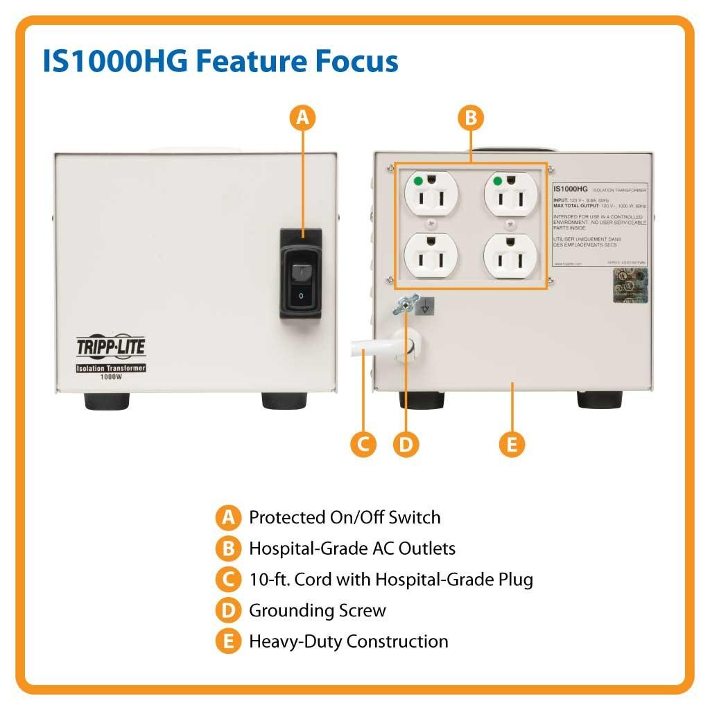 A 10-foot cord allows for flexible installation, while four hospital-grade NEMA 5-15R-HG output receptacles let you plug standard equipment into the IS1000HG without any adapters or custom power cords. Operation is easy; simply plug the IS1000HG into a grounded three-prong utility outlet, plug your equipment into the IS1000HG and turn the power on with simple, one-touch power switch.