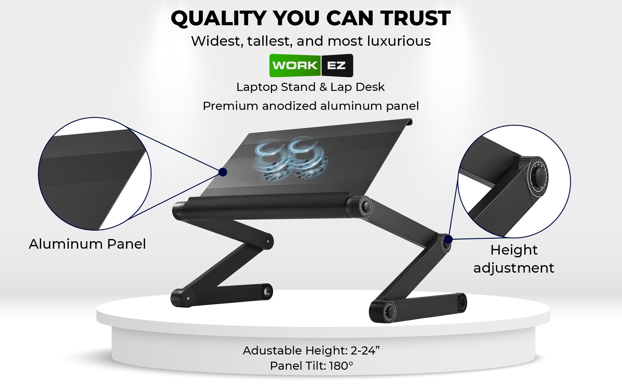 Durable aluminum creates a sturdy, lightweight, and useful adjustable laptop stand
