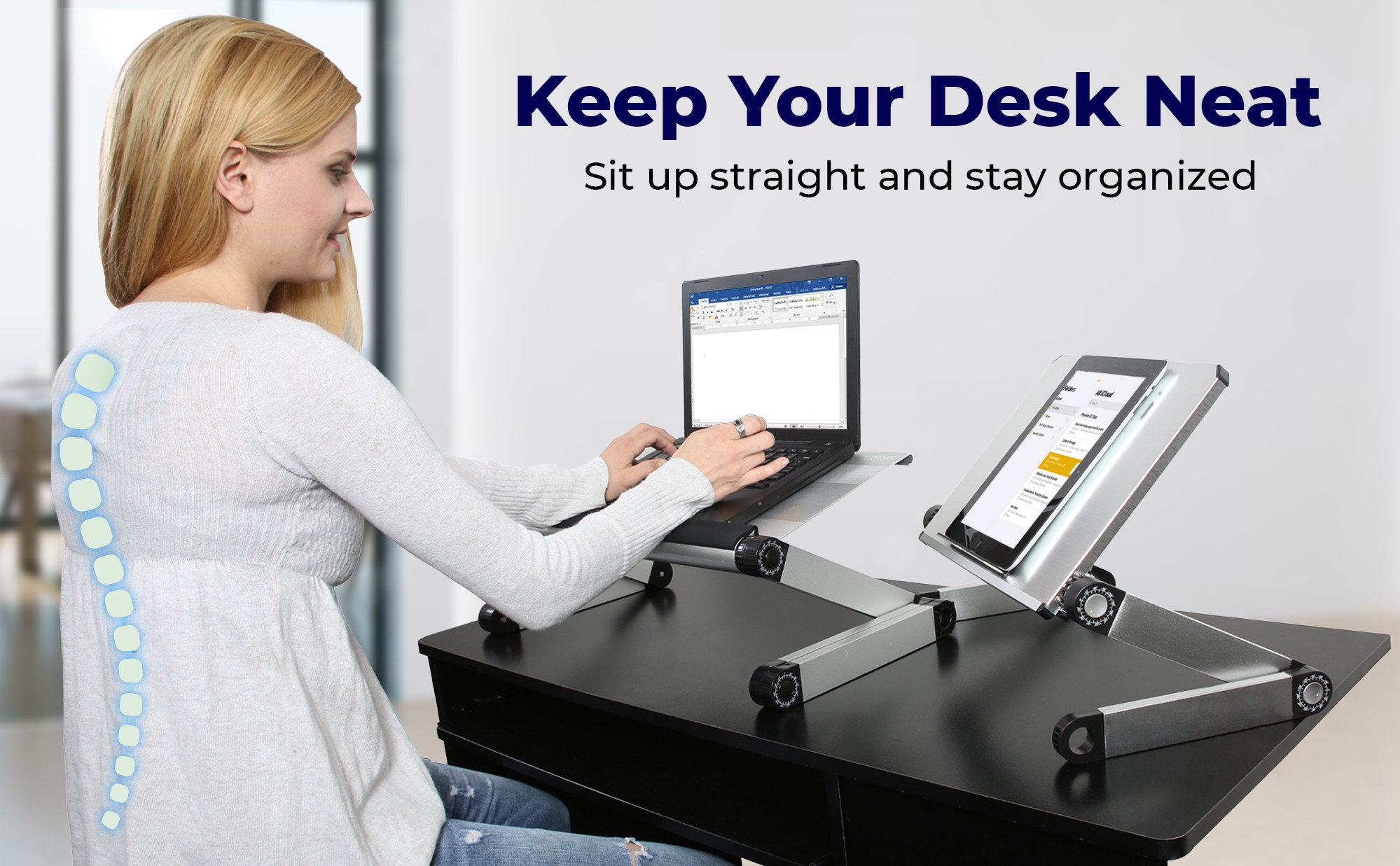 Tidy up, stay organized, and compute more comfortably with this adjustable laptop stand for desk