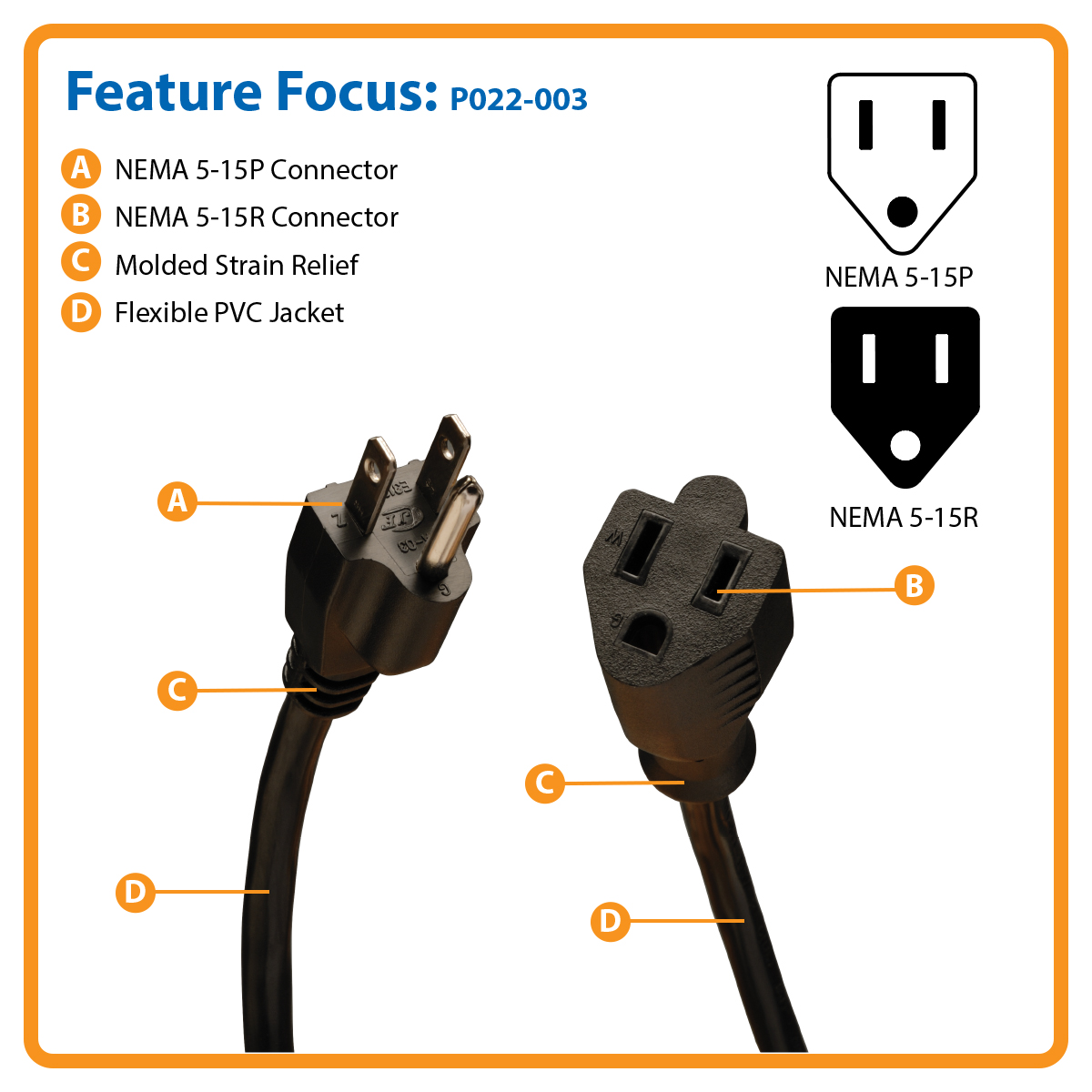 Tripp Lite's P022-003 Power Extension Cord gives you an extra 3 ft. between your equipment and the outlet. This 120V cord provides a NEMA 5-15R receptacle and a NEMA 5-15P plug, so it’s ready to connect to any standard plug, giving you additional cord length to access recessed or hard-to-reach outlets.