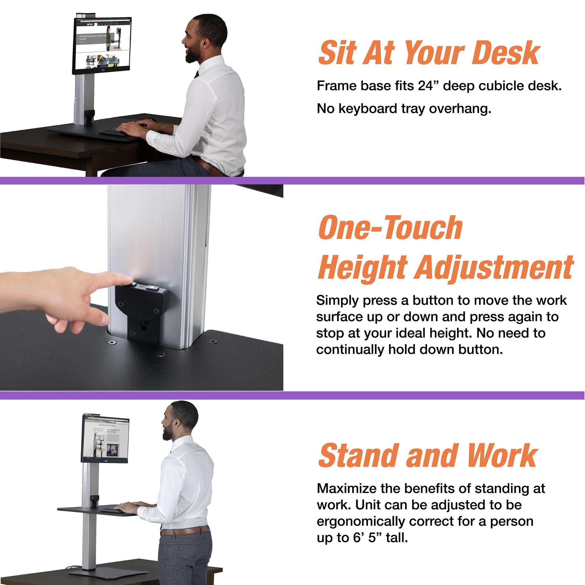 Need a break from standing? Simply push a button and lower the surface down to desktop level. Easy Tap Technology makes operation quick and simple. Press the button once to activate motor and raise desk. Press the button a second time to stop the work surface at desired height. Press button once to lower desk back to seated position.