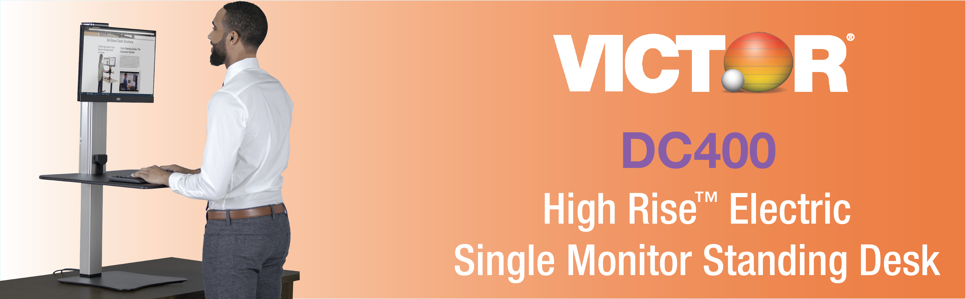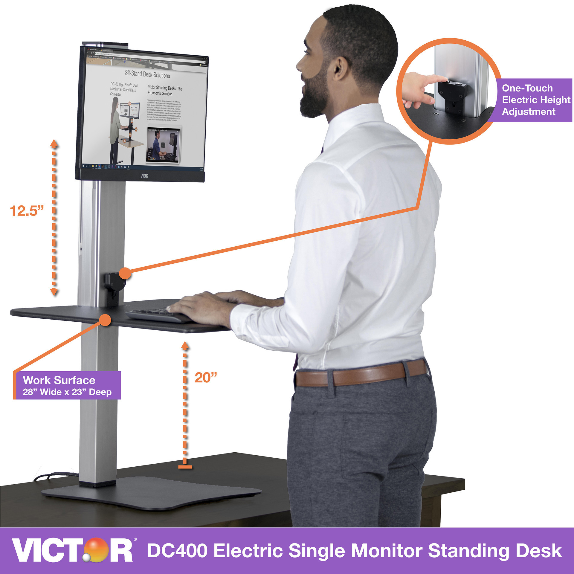 The Victor DC400 transforms any sit-down desk into a sitting OR standing desk. The 28” wide by 23” deep surface is raised up to 20” for ergonomic placement of monitor, keyboard, mouse, telephone and papers while standing. Electric motor design allows easy custom height adjustment with the push of a button. The monitor holder is also height-adjustable with a range of 12.5”.