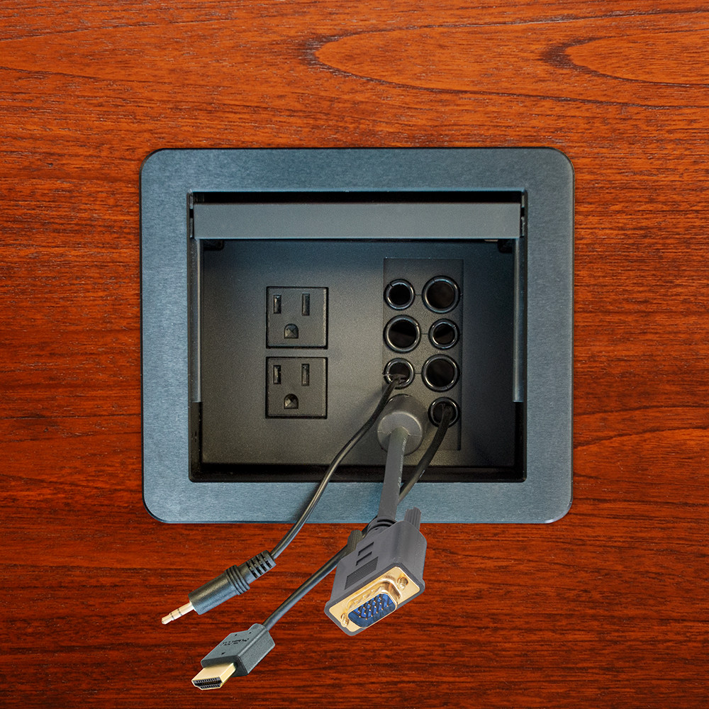 The Wireless Conference Table Box for HDMI, VGA + Audio provides a simple way to wirelessly connect an HDMI, VGA and audio source to a display, while also managing and delivering power. This table box features an HDMI, VGA, and Audio to HDMI Converter Switch which offers automatic or manual switching between an HDMI and VGA + Audio source device. The converter switch then connects to the Wireless A/V for HDMI Devices which provides video and audio to the display. The table box has an attractive finish that can match any conference room décor.