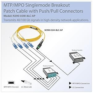 Designed for high-density fiber patching between data center main distribution frames (MDFs) and intermediate distribution frames (IDFs), Tripp Lite’s N390-03M-8LC-AP MTP/MPO Singlemode Breakout Patch Cable ensures peak performance throughout your local area network. With a female MTP/MPO connector on one end and eight LC duplex male connectors on the other, this 8.3/125-rated three-meter cable eliminates the need for splicing. It supports 40/100 Gb Ethernet speeds and is optimized for QSFP+ 40GBASE-PLR4 and QSFP28 100GBASE-PSM4 networks. It also features a plenum-rated jacket, so it’s perfect for connecting high-speed network components through ceilings, walls and ducts.