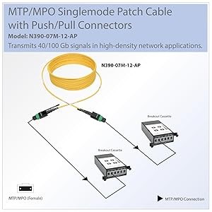 Designed for high-density fiber patching in QSFP+ enterprise applications, Tripp Lite’s N390-07M-12-AP MTP/MPO Singlemode Patch Cable with Push/Pull Tab Connectors ensures peak performance throughout your local area network. With two female MTP/MPO connectors, this seven-meter cable features a plenum-rated jacket, so it’s perfect for connecting high-speed network components through ceilings, walls and ducts.
