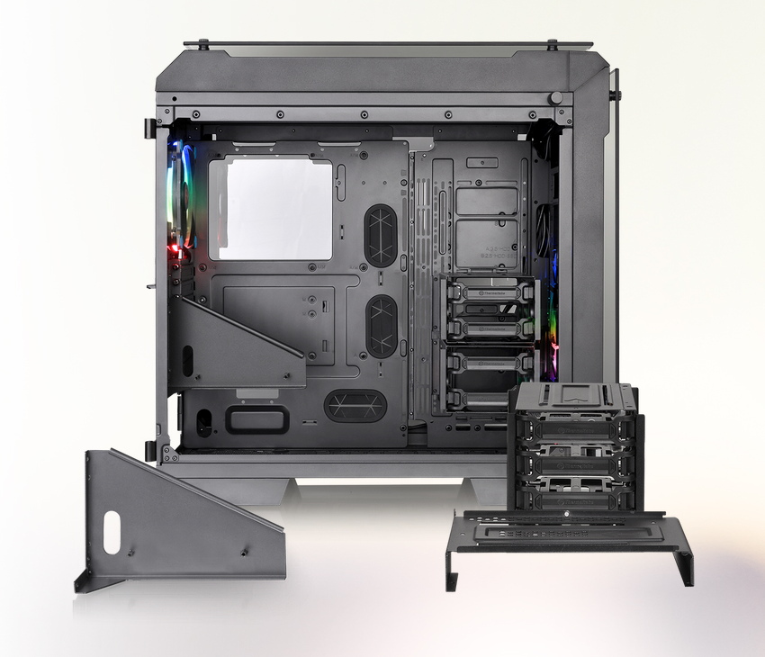 The View 71 TG RGB comes with full modular drive cages that allow easy installation/removal and maximizes the interior space for custom cooling loops. Above all, the tool-less drive bay design allows users to freely interchange the 3.5” and 2.5” hard-drives to suit their particular needs.