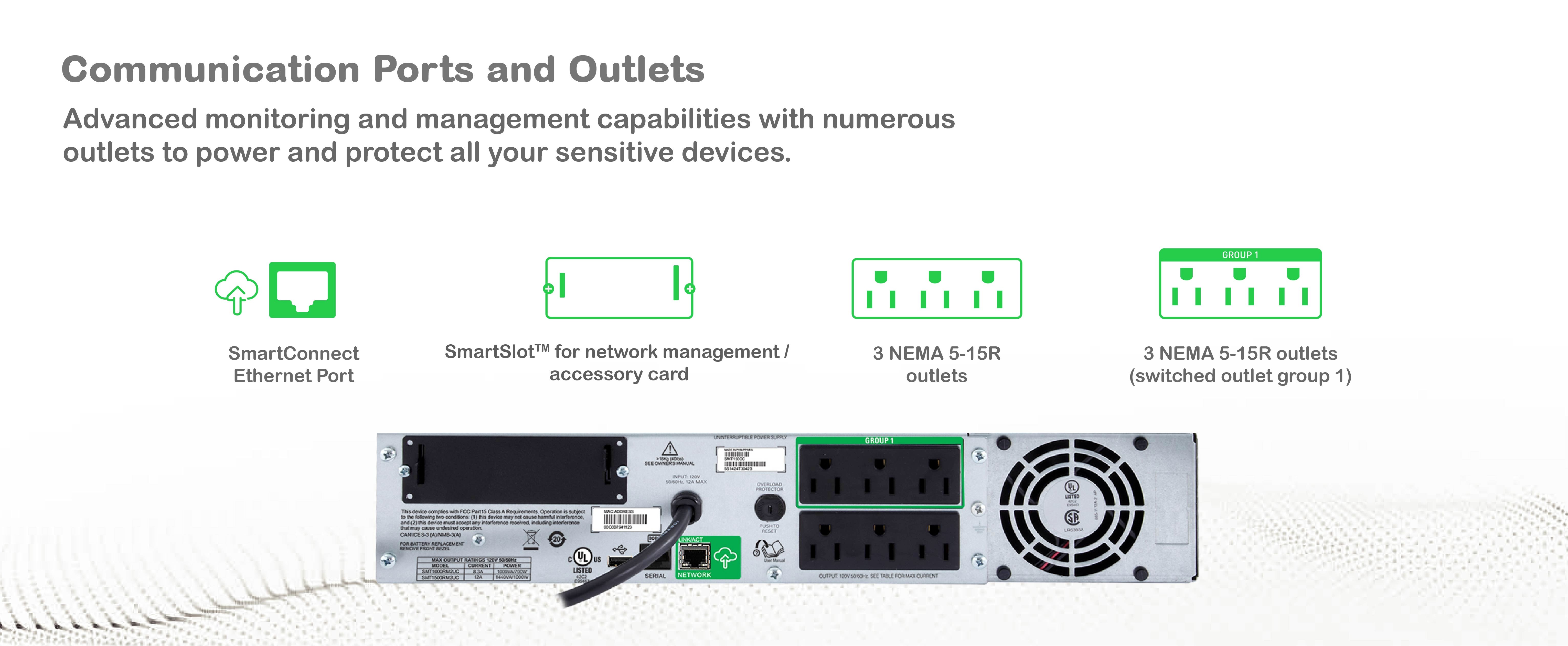 SmartSlot™ for network accessory card Add a network accessory card or purchase an -NC model with a pre-installed AP9641 network card. |