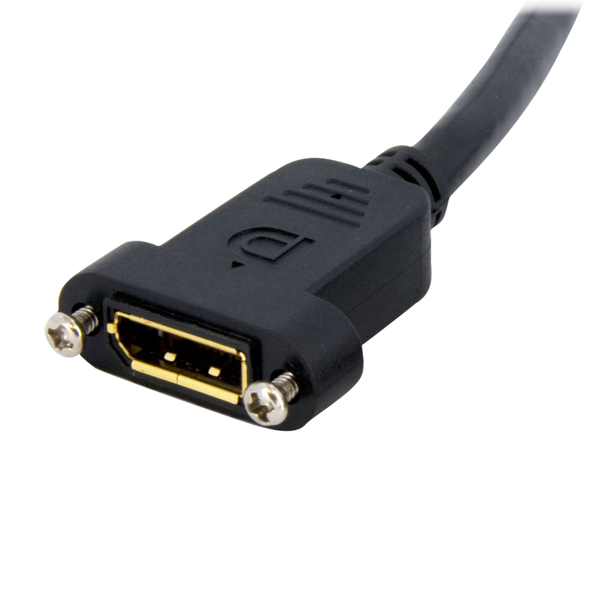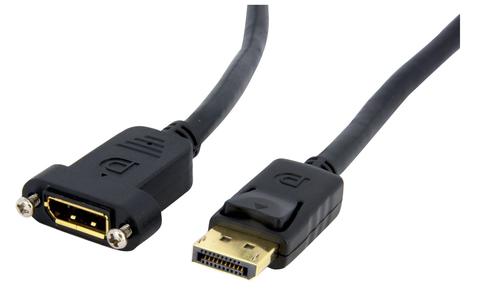 This 3ft panel mount DisplayPort cable features a DisplayPort male connector on one end, and a DisplayPort panel mount (female) molded connector on the other, providing a well-secured, easy to access DisplayPort connection on any machine port or faceplate.