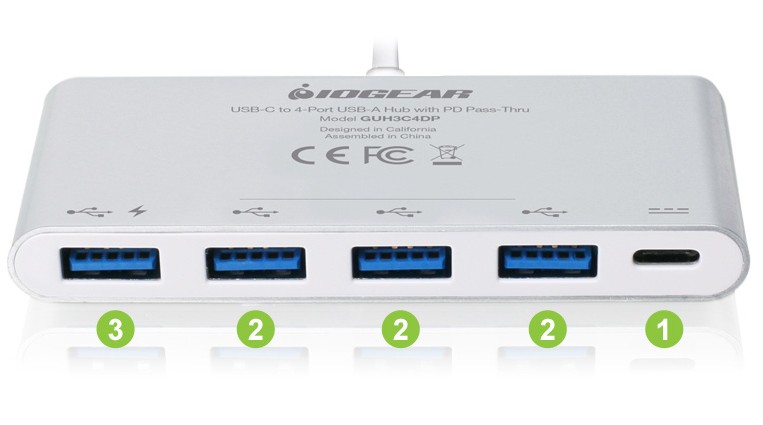 IOGEAR's USB-C to 4-port USB-A Hub expands your laptop's USB-C port into 4 additional USB 3.0 Type-A ports. Connect your current USB devices like hard drives, flash drives, keyboards and mice, cameras, USB cables and other USB devices. IOGEAR's Hub also provides a USB-C port on the front of the hub allowing you to charge your mobile device or charge your laptop by connecting your manufacturers USB-C power supply. This hub is essential for laptops that provide only one USB-C port with no additional ports for peripherals. This super compact and lightweight hub easily fits into any laptop case, briefcase or backpack making it convenient to take with you on-the-go. Thunderbolt 3 laptops are compatible with this hub making it a more affordable alternative.