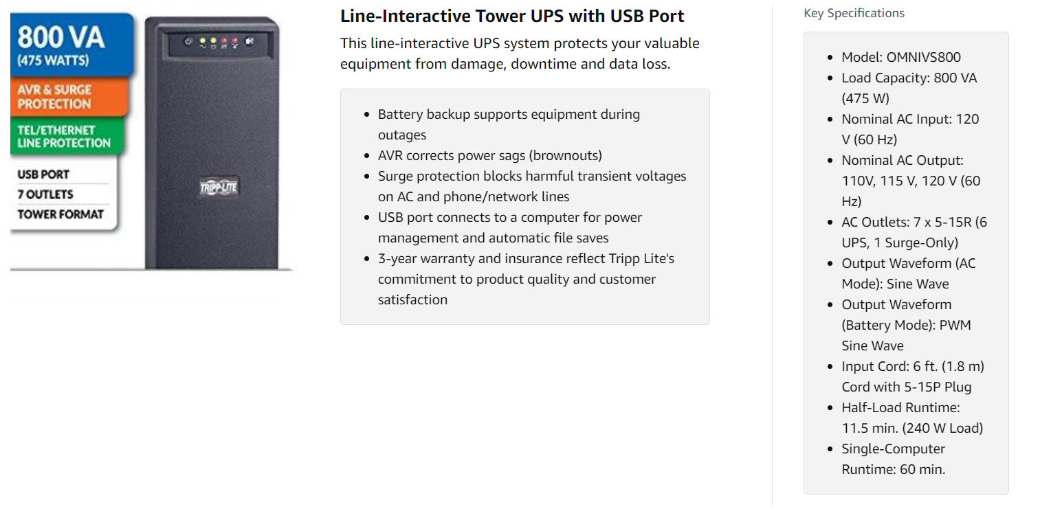 - Half-Load Runtime: This UPS system will support a 50% load (240 W) for up to 11.5 minutes.