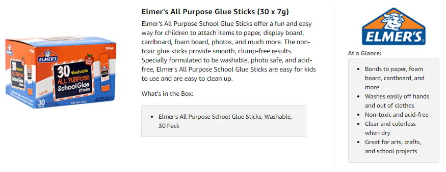Children can glue on items quickly with Elmer's All Purpose School Glue Sticks. Designed to go on smoothly, the glue dries quickly and is clear when dry.