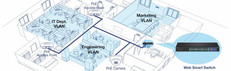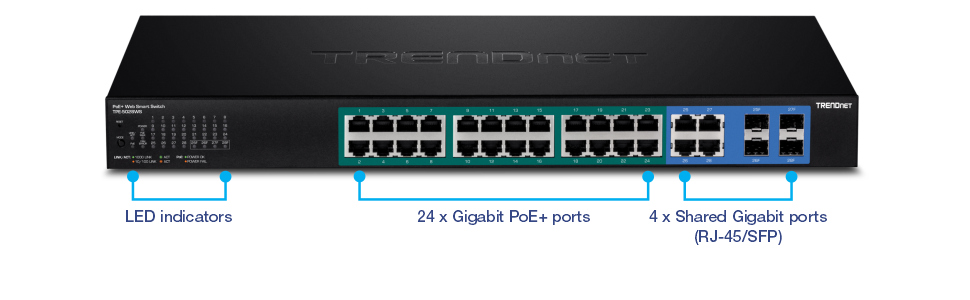 Installers and integrators can save on equipment costs and reduce installation time with TRENDnet’s Web Smart PoE+ Managed Switches by delivering up to 30W per port of PoE power and data over existing Ethernet cables. With PoE technology, users only need one set of cables to deliver both data and power. With this PoE+ managed switch, network PoE devices, such as high-power wireless access points, PTZ and other advanced IP cameras, VoIP phone systems, IPTV decoders, access controls, and more.