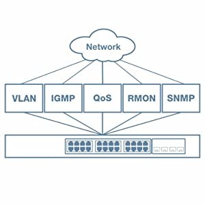 Managed features include access control lists, VLAN, IGMP snooping, QoS, RMON, SNMP trap, and syslog for monitoring and flexible network integration.
