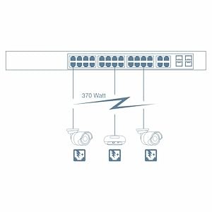 A 370W PoE power budget supplies power to PoE/PoE+ devices.