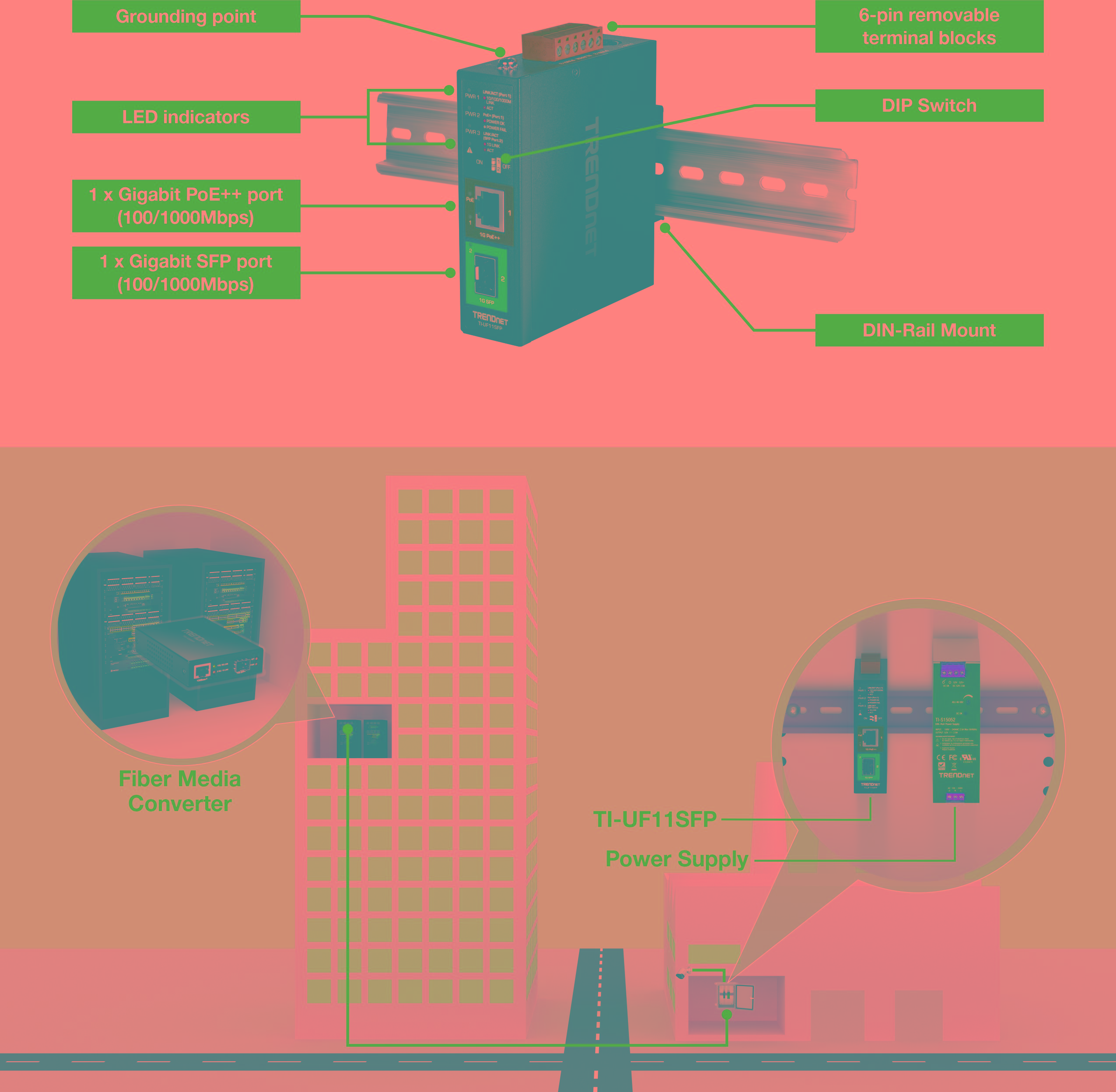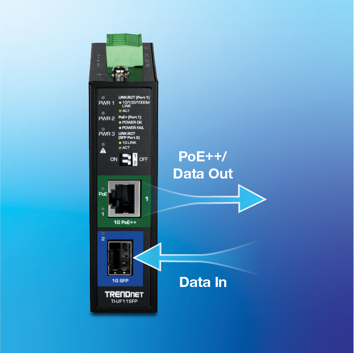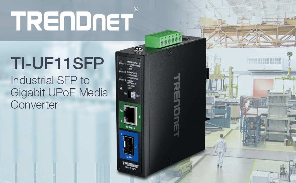 TRENDnet’s Industrial SFP to Gigabit PoE++ Media Converter (95W), model TI-UF11SFP, converts a long-distance fiber connection