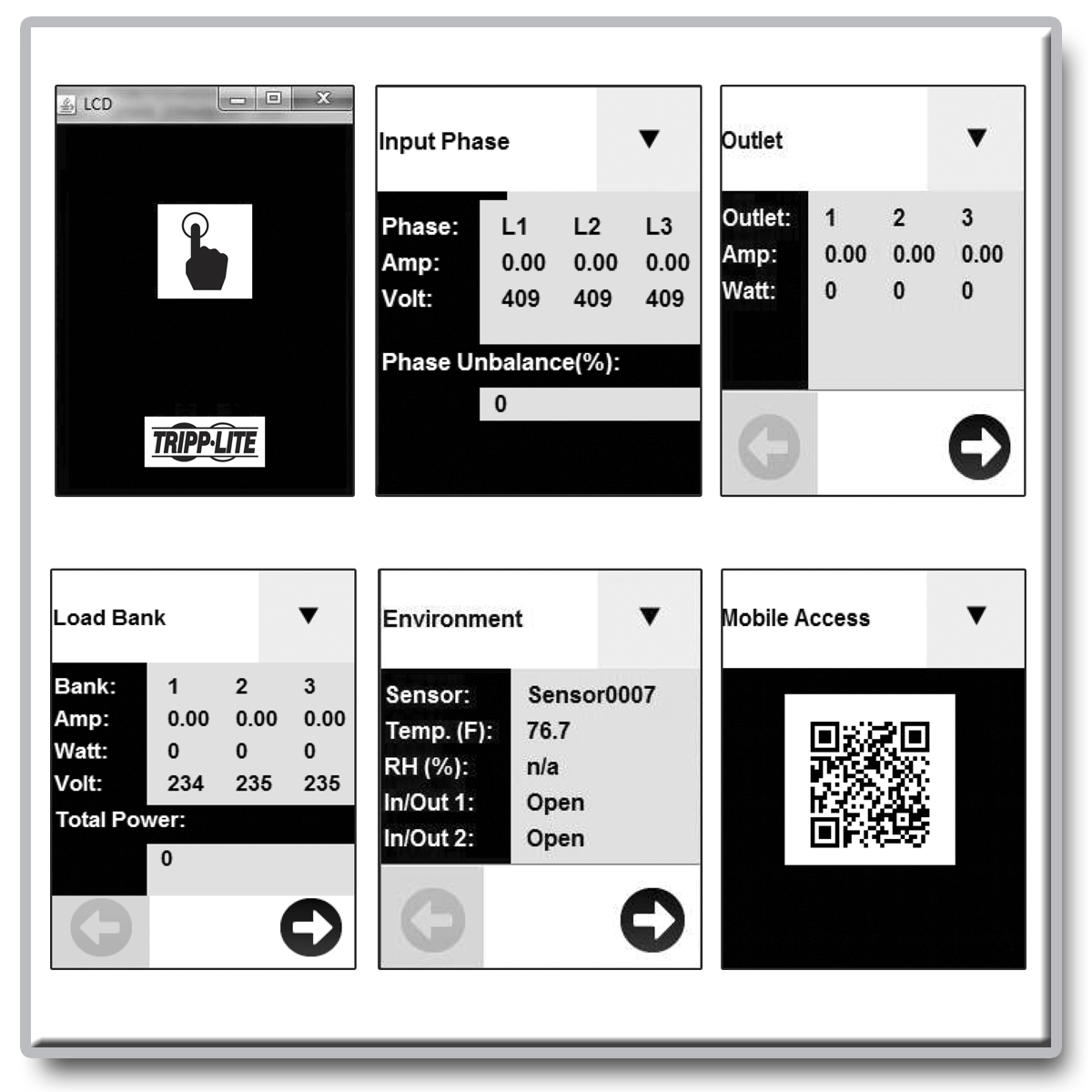 A color touchscreen LCD lets you toggle between menus to monitor input current level per phase, output current per load bank and per outlet with ±1% billing-grade accuracy, environmental sensor data and network information. The LCD also generates a unique QR code to allow access to the free downloadable PowerAlert® Device Manager through a mobile device. Full access is available by logging into PowerAlert via web browser as a user with read/write credentials.
