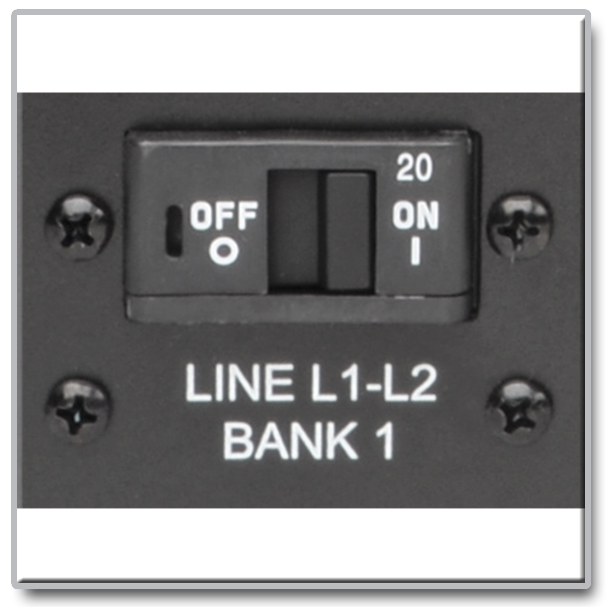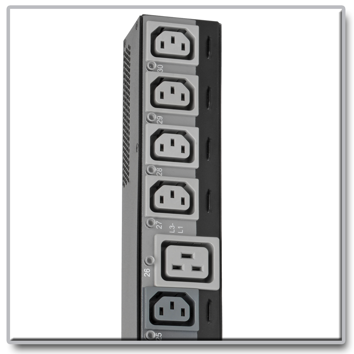 For a higher level of network power control, the 24 C13 and six C19 outlets can be individually controlled in real time. These controllable outlets enable power management tasks, including load shedding, load ramping, programming power-on and power-off sequences, and rebooting of locked-up network devices to be performed remotely. Unused outlets can be disabled to prevent the connection of unauthorized equipment loads. Each outlet has an LED that illuminates to confirm power on/off status.