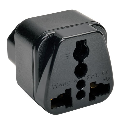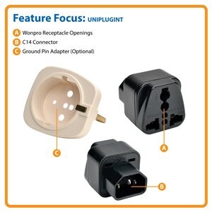 Tripp Lite's UNIPLUGINT outlet adapter enables the connection of a wide variety of international plugs into a standard IEC C13 outlet. Its Wonpro receptacle openings accept many international plug types, including common British, French and German. The UNIPLUGINT includes an additional ground pin adapter for plug connections that require an earth contact.