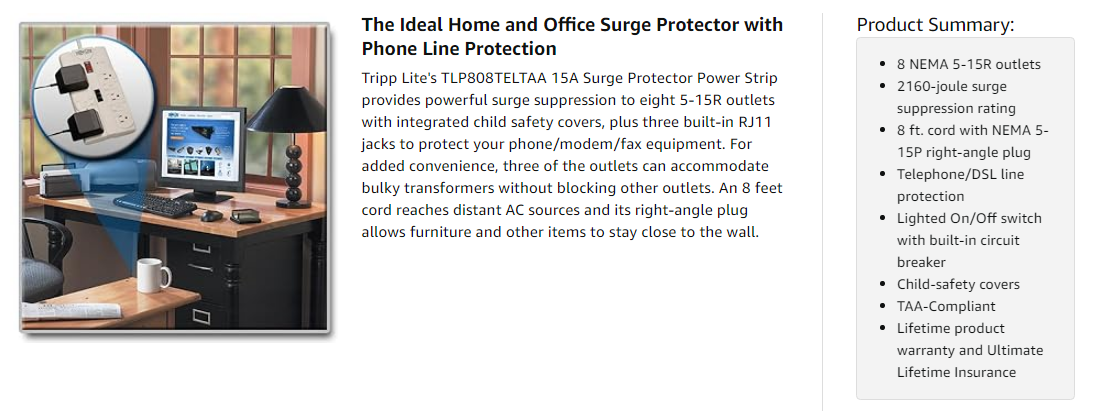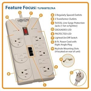 A phone connection represents a potential back door through which a damaging surge could reach your equipment. The TLP808TELTAA includes one set of built-in RJ11 jacks with splitter (1 in, 2 out) to prevent surges from damaging your modem/fax/phone equipment (6 feet telephone cord included).