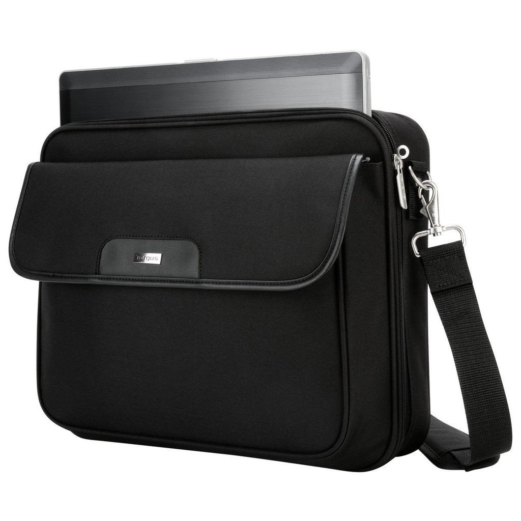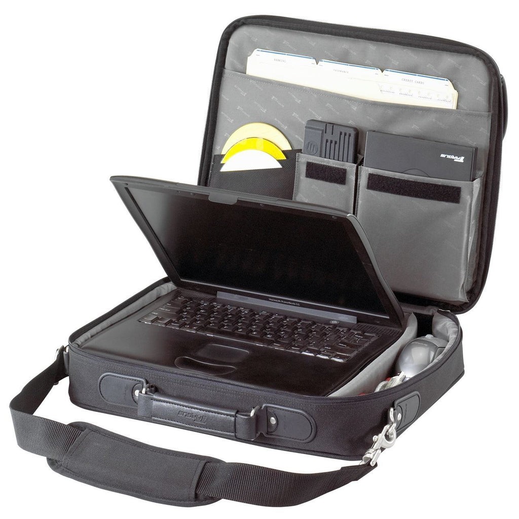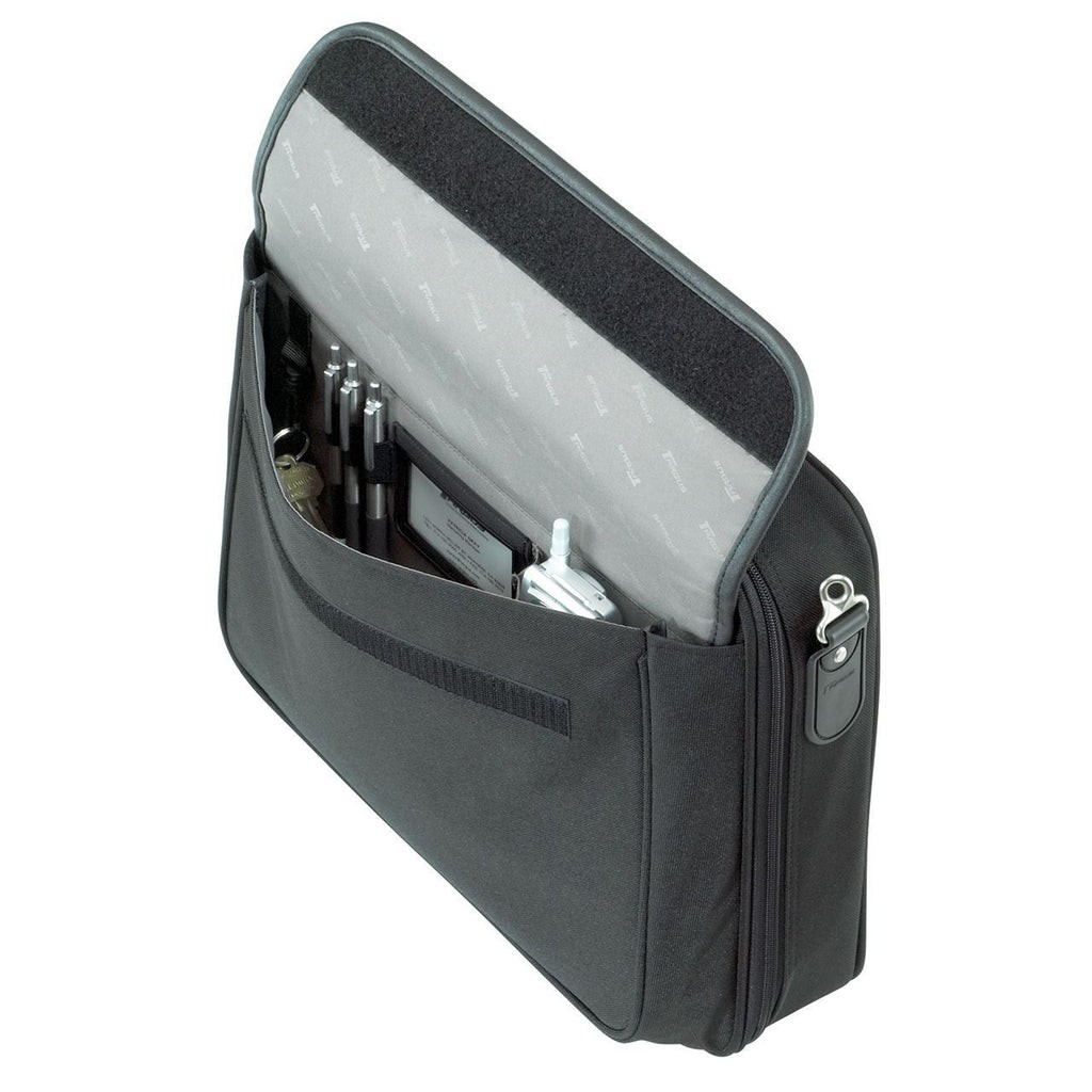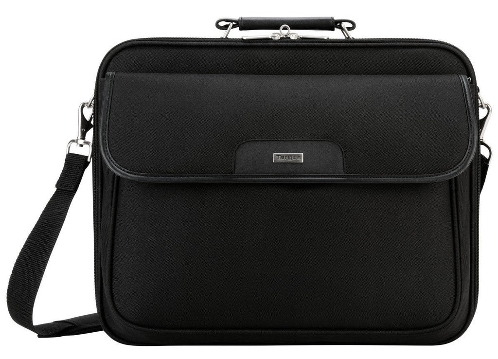 The Traditional Notepac Laptop Case now offers more. It includes a larger front pocket to accommodate folders and documents. The front zip-down workstation now includes: pen loops, key clip, business card holder, and phone pocket, putting your most commonly used items together and in easy reach. Storage has also been added to the main compartment with the addition of two pockets for accessories, a slip pocket for files as well as scratch resistant sleeves to hold 3 DVDs. Other improvements include a longer shoulder strap with additional padding, metal Targus logo, grey accent Targus lining, upgraded nickel hardware and newly designed zipper pulls making this case more attractive and functional.